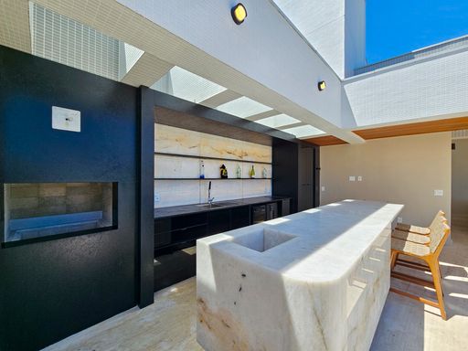 Na varanda decorada com móveis Tidelli, além de um dos elementos mais marcantes do imóvel: a parede e balcão da churrasqueira em Pedra Ônix iluminada, criando uma atmosfera elegante, cênica e absolutamente única.