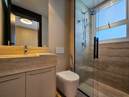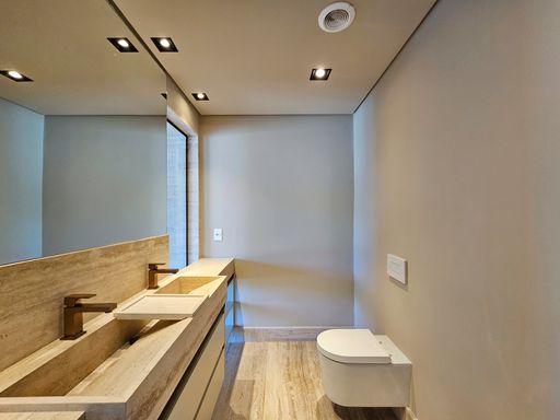 O interior impressiona desde o primeiro passo: todo piso e banheiros revestidos em mármore travertino romano, moveis planejados com lindo design da Florense, portas italianas com linda iluminação e banheiros com caixa acoplada embutida na parede, garantindo estética limpa, moderna e sofisticada.